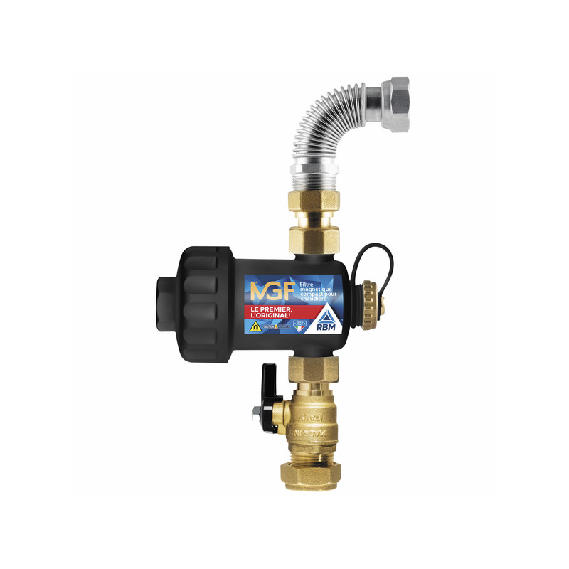 Le filtre magnétique MGF noir de chez RBM est ultra compact et s'installe rapidement. En installant le pot à boues RBM MGF sur la barrette de raccordement, sous une chaudière murale gaz, vous pouvez agir contre la corrosion qui agresse la tuyauterie de la chaudière. Le circuit de chauffage est alors préservé et la durée de vie du générateur est améliorée.