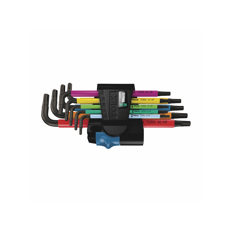 • 9x 967 SL TORX® HF Multicolour Clés mâles coudées TORX® avec fonction de retenue: TX 8x76 mm, TX 9x79 mm, TX 10x85 mm, TX 15x90 mm, TX 20x96 mm, TX 25x104 mm, TX 27x112 mm, TX 30x122 mm, TX 40x132 mm.